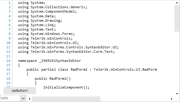 var editor = radSyntaxEditor1.SyntaxEditorElement;