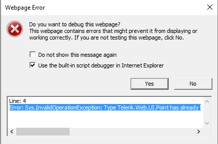 Error: "Error: Sys.InvalidOperationException: Type Telerik.Web.UI.Point has already been registered. The type may be defined multiple times or the script file that defines it may have already been loaded. A possible cause is a change of settings during a partial update."