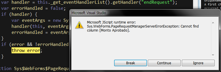 Sys.WebForms.PageRequestManagerServerErrorException: cannot find column [xxxxxx].