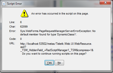 Sys.WebForms.PageRequestManagerServerErrorException: No default member found for type 'DynamicClass1'