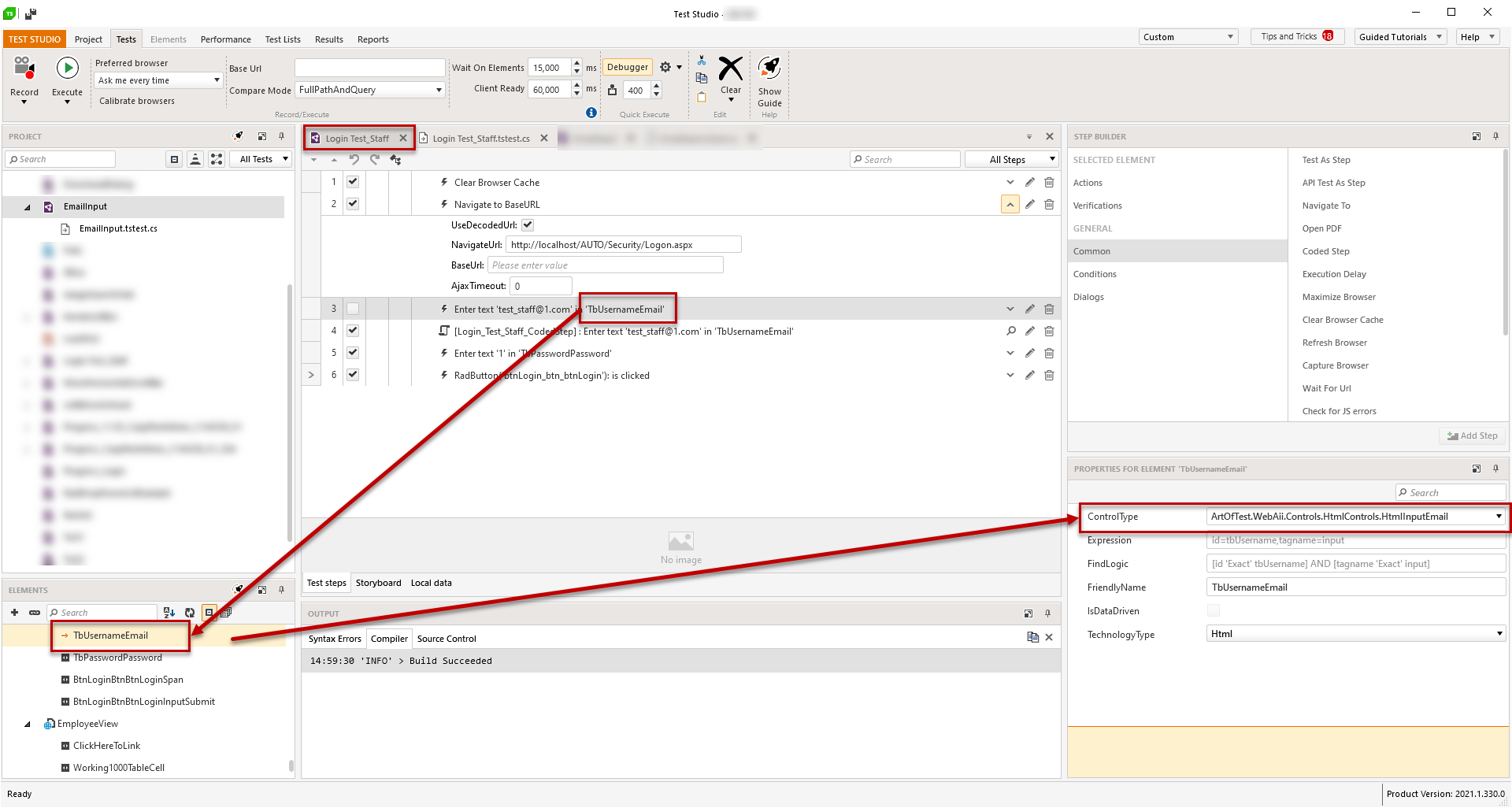 - Change the ControlType of the target element "TbUsernameEmail" to HtmlInputText to match the current state of the application under test. This will not immediately fix the execution of the coded step and if you need to run this code in a coded step rather than the recorded step 3, you need to close all web test and restart Test Studio. That will refresh the references and ControlType that of the changed element.