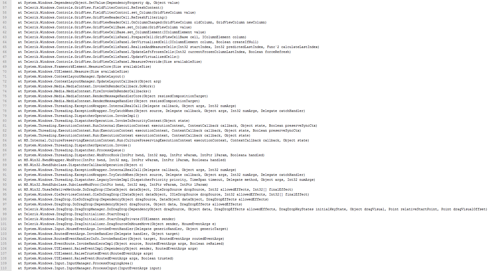 When I have the FilteringMode set to FilterRow and the filter field of the text column contains some text I get a System.FormatException while dragging the status column over this text column saying that the value from the filter field is not a valid value for the status column.