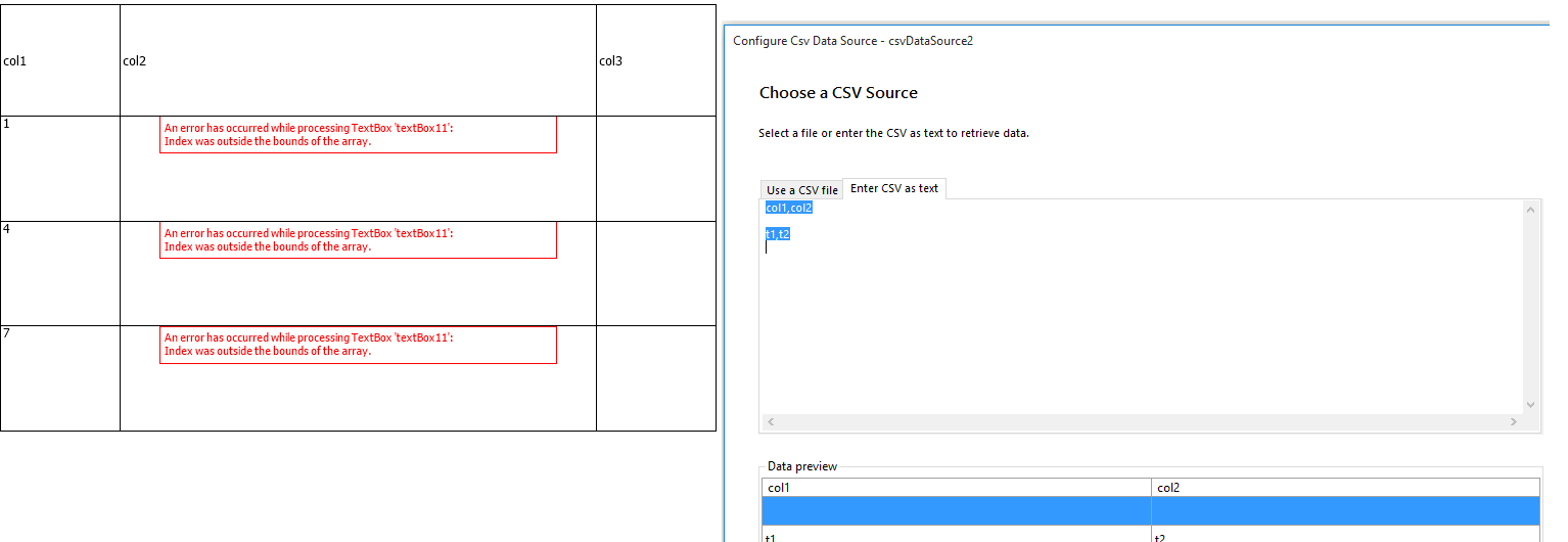I did modify the data csvDatasource2 on table 2 of your report, and it produces the error that I was getting before. If a row in table 2 does not contain data, and the following row contains data then it produces the error(see png file). Unfortunately, I am only allowed to attache gif, jpg, jpeg, and png files; I can't attach the zip file to show you the problem. Just change the CSV to the following context, and leave one row empty and shown below.
