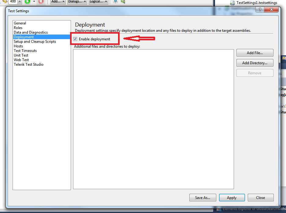 Could you please try to enable the deployment in the test settings file and let me know if this helps.