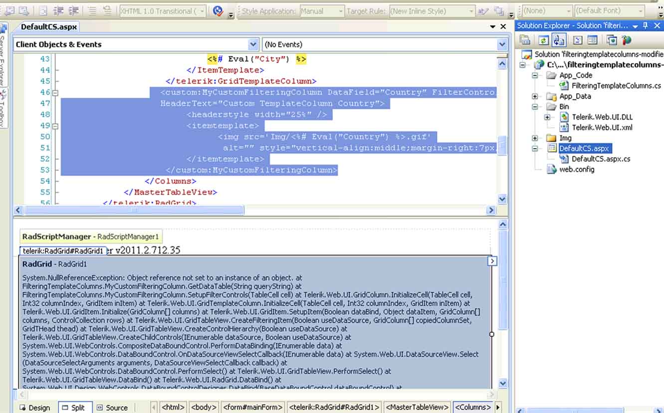 After adding the FilteringTemplateColumns.cs in APP_Code folder, I am getting attached error message.