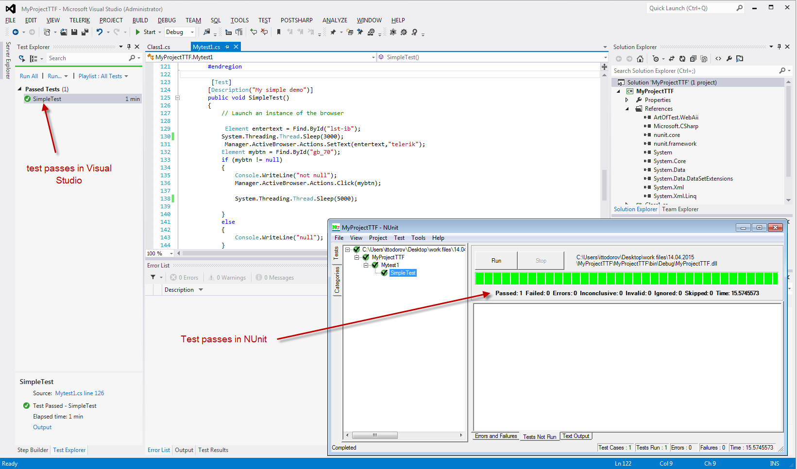 below is the zip contains my sample test (Mytest1) created with Nunit suite file and I'm executing this with 'Unit Test Window' and I'm getting the 'Null reference exception : object reference not set to an instance of an object' at Locating the element (returns null) in VS community 2013 .Please verify and let me know