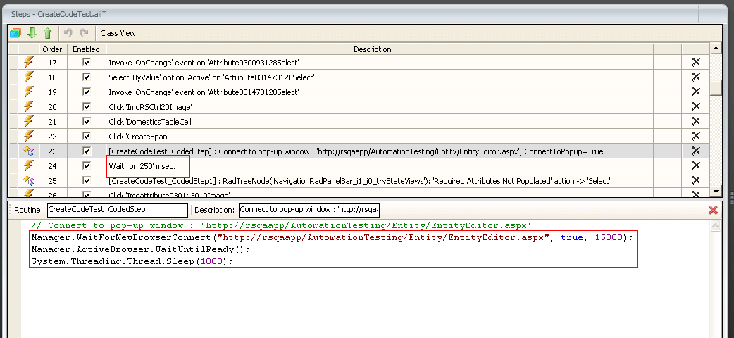 Exception thrown executing coded step: '[CreateCodeTest_CodedStep] : Connect to pop-up window : 'http://rsqaapp/AutomationTesting/Entity/EntityEditor.aspx', ConnectToPopup=True'.