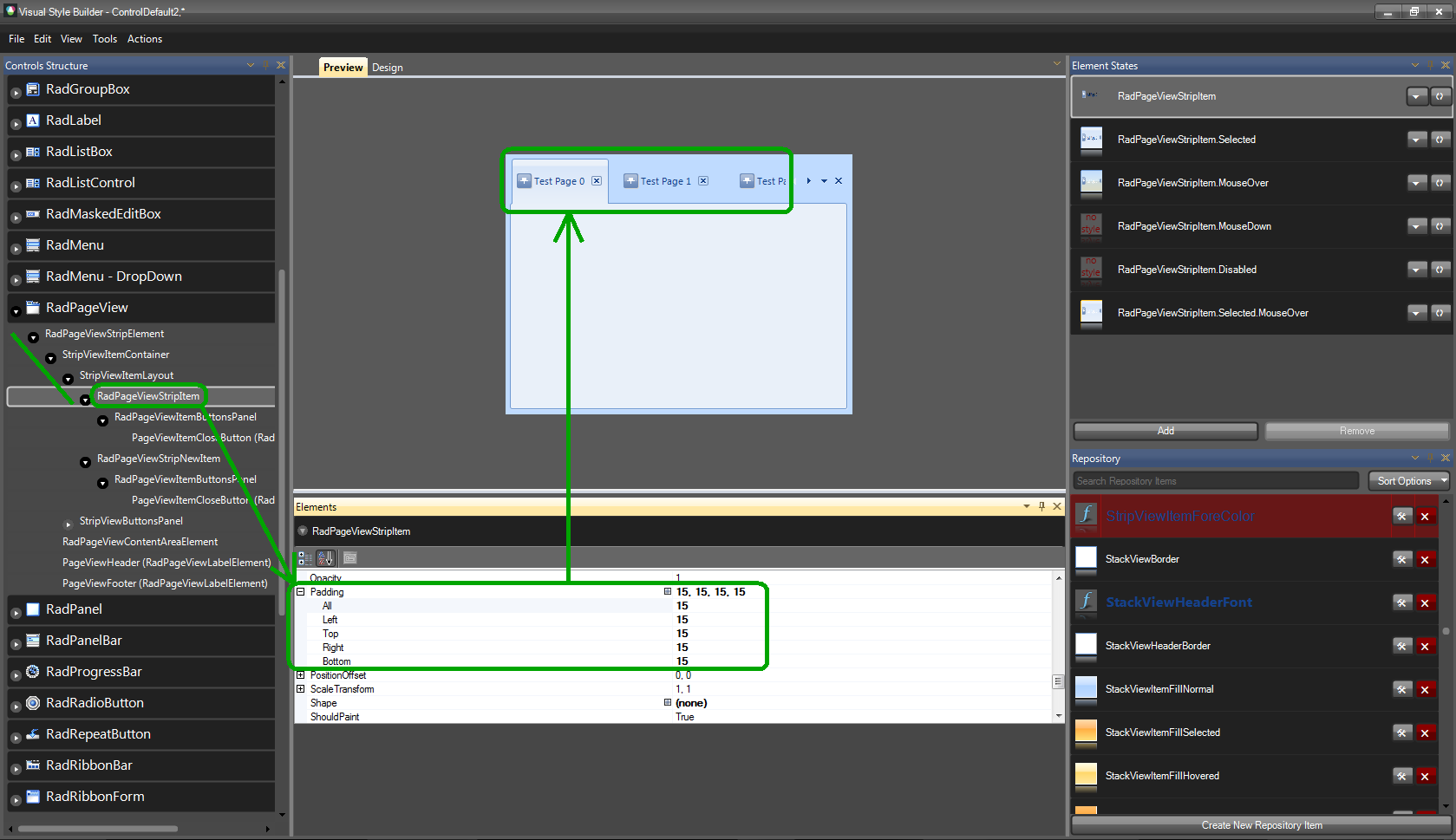 Padding newPadding = new Padding(20);foreach (RadPageViewPage page in this.radPageView1.Pages){ page.Item.Padding = newPadding;}If you choose to change the padding through the theme, you have to navigate to: