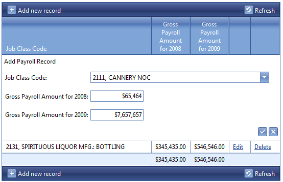 <telerik:RadGrid ID="gvGrossPayroll" runat="server" AllowAutomaticDeletes="True" AllowAutomaticUpdates="True" AllowAutomaticInserts="False" OnInsertCommand="gvGrossPayroll_InsertCommand" AutoGenerateColumns="False" DataSourceID="SDS_Payroll" GridLines="None" OnItemCommand="gvGrossPayroll_ItemCommand" ShowFooter="True" Skin="Web20" Width="544px"> <MasterTableView AutoGenerateColumns="False" CommandItemDisplay="TopAndBottom" DataKeyNames="ID" DataSourceID="SDS_Payroll"> <RowIndicatorColumn> <HeaderStyle Width="20px" /> </RowIndicatorColumn> <ExpandCollapseColumn> <HeaderStyle Width="20px" /> </ExpandCollapseColumn> <CommandItemSettings /> <Columns> <telerik:GridBoundColumn DataField="id" ReadOnly="True" UniqueName="ID" Visible="False"> </telerik:GridBoundColumn> <telerik:GridTemplateColumn EditFormColumnIndex="0" HeaderText="Job Class Code" DataField="JobClass" UniqueName="JobClass" Visible="true" ReadOnly="False" HeaderStyle-VerticalAlign="Bottom"> <ItemTemplate> <asp:Label ID="JobClass" runat="server" Text='<%# Bind("JobClass") %>'></asp:Label> </ItemTemplate> <InsertItemTemplate> <telerik:RadComboBox ID="ddlJobClassID" Runat="server" AllowCustomText="True" DataSourceID="SqlDataSourceDDL" DataTextField="JobClass" DataValueField="JobClassID" EmptyMessage="Please enter a job class code" EnableViewState="False" AppendDataBoundItems="true" ErrorMessage="You must enter a job class code to add a record" MarkFirstMatch="True" ShowDropDownOnTextboxClick="False" Skin="Web20" ToolTip="Enter a Job Class Code" Width="350px" SelectedValue='<%# Bind("JobClassID") %>'> </telerik:RadComboBox> <asp:RequiredFieldValidator ID="RequiredFieldValidator1" runat="server" ErrorMessage="Job Class Code is a required field" Font-Bold="True" Font-Names="Arial Narrow" ForeColor="Red" ControlToValidate="ddlJobClassID" ToolTip="Job Class Code is a required field">X </asp:RequiredFieldValidator> </InsertItemTemplate> <EditItemTemplate> <asp:Label ID="JobClass" runat="server" Text='<%# Bind("JobClassID") %>'></asp:Label> </EditItemTemplate> <HeaderStyle VerticalAlign="Bottom" /> </telerik:GridTemplateColumn> <telerik:GridTemplateColumn EditFormColumnIndex="0" HeaderText="Year1" UniqueName="PayrollAmount1" Visible="true" Aggregate="Sum" DataField="PayrollAmount1" FooterAggregateFormatString="{0:C}" HeaderStyle-Width="60px"> <ItemTemplate> <asp:Label ID="PayrollAmount1" runat="server" Text='<%# Eval("PayrollAmount1", "{0:C}") %>'></asp:Label> </ItemTemplate> <InsertItemTemplate> <telerik:RadNumericTextBox ID="txtPayrollAmount1a" Runat="server" Culture="English (United States)" MinValue="0" NumberFormat-DecimalDigits="0" Skin="Web20" TabIndex="2" ToolTip="Payroll Amount" Type="Currency" Width="100px" Value="0" Text='<%# Bind("PayrollAmount1") %>' > <EnabledStyle HorizontalAlign="Right" /> <NumberFormat DecimalDigits="0" /> </telerik:RadNumericTextBox> </InsertItemTemplate> <EditItemTemplate> <telerik:RadNumericTextBox ID="txtPayrollAmount1" Runat="server" Culture="English (United States)" MinValue="0" NumberFormat-DecimalDigits="0" Skin="Web20" TabIndex="2" ToolTip="Payroll Amount" Type="Currency" Text='<%# Bind("PayrollAmount1") %>' Width="100px"> <EnabledStyle HorizontalAlign="Right" /> <NumberFormat DecimalDigits="0" /> </telerik:RadNumericTextBox> </EditItemTemplate> <FooterStyle Font-Bold="False" Font-Italic="False" Font-Overline="False" Font-Strikeout="False" Font-Underline="False" HorizontalAlign="Right" Wrap="True" /> <HeaderStyle Font-Bold="False" Font-Italic="False" Font-Overline="False" Font-Strikeout="False" Font-Underline="False" HorizontalAlign="Center" Wrap="True" /> <ItemStyle Font-Bold="False" Font-Italic="False" Font-Overline="False" Font-Strikeout="False" Font-Underline="False" HorizontalAlign="Right" Wrap="True" /> </telerik:GridTemplateColumn> <telerik:GridTemplateColumn EditFormColumnIndex="0" HeaderText="Year2" UniqueName="PayrollAmount2" Visible="true" DataField="PayrollAmount2" Aggregate="Sum" FooterAggregateFormatString="{0:C}" HeaderStyle-Width="60px" > <ItemTemplate> <asp:Label ID="PayrollAmount2" runat="server" Text='<%# Eval("PayrollAmount2", "{0:C}") %>'></asp:Label> </ItemTemplate> <InsertItemTemplate> <telerik:RadNumericTextBox ID="txtPayrollAmount2" Runat="server" Culture="English (United States)" MinValue="0" NumberFormat-DecimalDigits="0" Skin="Web20" TabIndex="2" ToolTip="Payroll Amount" Type="Currency" Value="0" Width="100px" Text='<%# Bind("PayrollAmount2") %>'> <EnabledStyle HorizontalAlign="Right" /> <NumberFormat DecimalDigits="0" /> </telerik:RadNumericTextBox> </InsertItemTemplate> <EditItemTemplate> <telerik:RadNumericTextBox ID="txtPayrollAmount2" Runat="server" Culture="English (United States)" MinValue="0" NumberFormat-DecimalDigits="0" Skin="Web20" TabIndex="2" ToolTip="Payroll Amount" Type="Currency" Width="100px" Text='<%# Bind("PayrollAmount2") %>'> <EnabledStyle HorizontalAlign="Right" /> <NumberFormat DecimalDigits="0" /> </telerik:RadNumericTextBox> </EditItemTemplate> <FooterStyle Font-Bold="False" Font-Italic="False" Font-Overline="False" Font-Strikeout="False" Font-Underline="False" HorizontalAlign="Right" Wrap="True" /> <HeaderStyle Font-Bold="False" Font-Italic="False" Font-Overline="False" Font-Strikeout="False" Font-Underline="False" HorizontalAlign="Center" Wrap="True" /> <ItemStyle Font-Bold="False" Font-Italic="False" Font-Overline="False" Font-Strikeout="False" Font-Underline="False" HorizontalAlign="Right" Wrap="True" /> </telerik:GridTemplateColumn> <telerik:GridEditCommandColumn> </telerik:GridEditCommandColumn> <telerik:GridButtonColumn CommandName="Delete" ConfirmText="Delete this payroll record?" ImageUrl="/images/delete.gif" Text="Delete" UniqueName="column3"> </telerik:GridButtonColumn> <telerik:GridBoundColumn DataField="MemberID" DataType="System.Int16" UniqueName="MemberID" ReadOnly="True" Visible="False"> </telerik:GridBoundColumn> </Columns> <EditFormSettings CaptionDataField="MemberID" CaptionFormatString="Edit Payroll Record" ColumnNumber="1" I