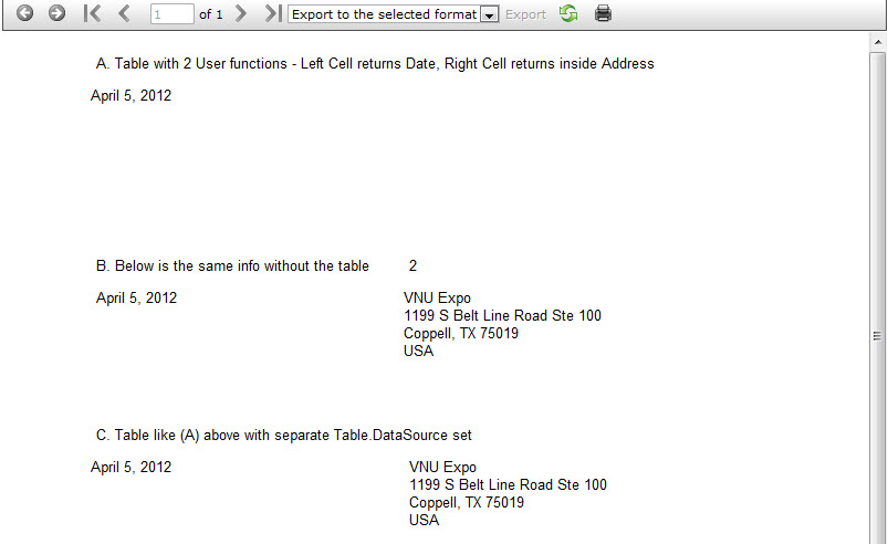 Public Class UserFunctions Public Shared Function GetAddress(ByVal Name As Object, ByVal Addr1 As Object, ByVal Addr2 As Object, ByVal City As Object, ByVal State As Object, ByVal PostalCode As Object, ByVal Country As Object) As String Dim address As String = "" If Not IsDBNull(Name) AndAlso Name IsNot Nothing Then address &= Name.ToString.Trim & vbCr End If If Not IsDBNull(Addr1) AndAlso Addr1 IsNot Nothing Then address &= Addr1.ToString.Trim & vbCr End If If Not IsDBNull(Addr2) AndAlso Addr2 IsNot Nothing AndAlso Addr2.ToString.Trim.Length > 0 Then address &= Addr2.ToString.Trim & vbCr End If If Not IsDBNull(City) AndAlso City IsNot Nothing Then address &= City.ToString.Trim End If If Not IsDBNull(State) AndAlso State IsNot Nothing Then address &= ", " & State.ToString.Trim End If If Not IsDBNull(PostalCode) AndAlso PostalCode IsNot Nothing Then address &= " " & PostalCode.ToString.Trim & vbCr End If If Not IsDBNull(Country) AndAlso Country IsNot Nothing AndAlso Country.ToString.Trim.Length > 0 Then address &= Country.ToString.Trim End If Return address End Function Public Shared Function GetLetterDate() As String Dim val As String = "" val = Now().ToString("MMMM d, yyyy") Return val End Function End ClassThe first function GetAddress takes several input parameters and builds an address. The second function GetLetterDate() returns a date in the format (April 5, 2012).