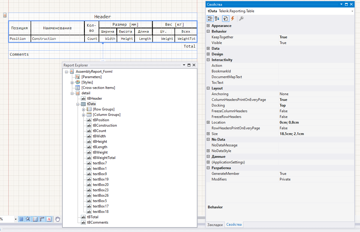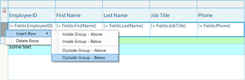 My report has a simple table. A text field is placed under the table. The table and text field have the Docking property set to Top.