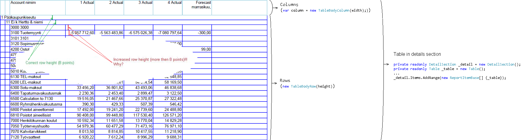 We cannot advise only by the screenshot you have provided, but it looks like the "correctly sized" row groups are static headers, while the one you claim have grown are the rows from the detail group. We would be able to provide more info if that is the case, when we review your report. Generally, you do not need to apply Docking or Anchoring to report items added in Table/CrossTab cells, so you can remove this from your code.
