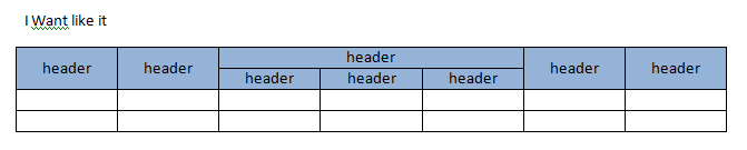 01.public static void TesGenDoc()02. {03. RadFlowDocument document = new RadFlowDocument();04. 05. DocxFormatProvider provider = new DocxFormatProvider();06. RadFlowDocumentEditor editor = new RadFlowDocumentEditor(document);07. 08. string reportFilePathDir = @"..\tes.docx";09. // Start to Generate Monber Doc10. using (Stream output = new FileStream(reportFilePathDir, FileMode.OpenOrCreate))11. {12. //*WRITE COVER13. editor.CharacterFormatting.FontFamily.LocalValue = new ThemableFontFamily("Arial");14. editor.CharacterFormatting.FontSize.LocalValue = 14;15. editor.CharacterFormatting.FontWeight.LocalValue = FontWeights.Bold;16. 17. /*Table*/18. Style style = new Style("ok", StyleType.Table);19. style.CharacterProperties.ForegroundColor.LocalValue = new ThemableColor(System.Windows.Media.Colors.Black);20. style.CharacterProperties.FontWeight.LocalValue = FontWeights.Bold;21. style.CharacterProperties.FontSize.LocalValue = 9;22. 23. document.StyleRepository.Add(style);24. 25. Table table = editor.InsertTable();26. table.PreferredWidth = new TableWidthUnit(TableWidthUnitType.Percent, 100);27. 28. document.StyleRepository.AddBuiltInStyle(BuiltInStyleNames.TableGridStyleId);29. table.StyleId = BuiltInStyleNames.TableGridStyleId;30. 31. //header32. TableRow rowHeader = table.Rows.AddTableRow();33. rowHeader.RepeatOnEveryPage = true;34. 35. //number cell header36. TableCell cellNumberHeader = rowHeader.Cells.AddTableCell();37. cellNumberHeader.Blocks.AddParagraph().Inlines.AddRun("Header").FontWeight = FontWeights.Bold; cellNumberHeader.Shading.BackgroundColor = new ThemableColor(System.Windows.Media.Colors.LightGray);38. cellNumberHeader.RowSpan = 2; cellNumberHeader.ColumnSpan = 1; 39. 40. cellNumberHeader = rowHeader.Cells.AddTableCell();41. cellNumberHeader.Blocks.AddParagraph().Inlines.AddRun("Header").FontWeight = FontWeights.Bold; cellNumberHeader.Shading.BackgroundColor = new ThemableColor(System.Windows.Media.Colors.LightGray);42. cellNumberHeader.RowSpan = 2; cellNumberHeader.ColumnSpan = 1;43. 44. cellNumberHeader = rowHeader.Cells.AddTableCell();45. cellNumberHeader.Blocks.AddParagraph().Inlines.AddRun("Header").FontWeight = FontWeights.Bold; cellNumberHeader.Shading.BackgroundColor = new ThemableColor(System.Windows.Media.Colors.LightGray);46. cellNumberHeader.RowSpan = 1; cellNumberHeader.ColumnSpan = 3;47. 48. cellNumberHeader = rowHeader.Cells.AddTableCell();49. cellNumberHeader.Blocks.AddParagraph().Inlines.AddRun("Header").FontWeight = FontWeights.Bold; cellNumberHeader.Shading.BackgroundColor = new ThemableColor(System.Windows.Media.Colors.LightGray);50. cellNumberHeader.RowSpan = 2; cellNumberHeader.ColumnSpan = 1;51. 52. cellNumberHeader = rowHeader.Cells.AddTableCell();53. cellNumberHeader.Blocks.AddParagraph().Inlines.AddRun("Header").FontWeight = FontWeights.Bold; cellNumberHeader.Shading.BackgroundColor = new ThemableColor(System.Windows.Media.Colors.LightGray);54. cellNumberHeader.RowSpan = 2; cellNumberHeader.ColumnSpan = 1;55. 56. TableRow rowHeader1 = table.Rows.AddTableRow();57. rowHeader1.RepeatOnEveryPage = true;58. 59. TableCell c1 = rowHeader1.Cells.AddTableCell();60. c1.Blocks.AddParagraph().Inlines.AddRun("Header");61. c1 = rowHeader1.Cells.AddTableCell();62. c1.Blocks.AddParagraph().Inlines.AddRun("Header");63. c1 = rowHeader1.Cells.AddTableCell();64. c1.Blocks.AddParagraph().Inlines.AddRun("Header");65. 66. TableRow rowHeader2 = table.Rows.AddTableRow();67. TableCell c2 = rowHeader2.Cells.AddTableCell();68. c2.Blocks.AddParagraph().Inlines.AddRun("");69. c2 = rowHeader1.Cells.AddTableCell();70. c2.Blocks.AddParagraph().Inlines.AddRun("");71. c2 = rowHeader1.Cells.AddTableCell();72. c2.Blocks.AddParagraph().Inlines.AddRun("");73. c2 = rowHeader1.Cells.AddTableCell();74. c2.Blocks.AddParagraph().Inlines.AddRun("");75. c2 = rowHeader1.Cells.AddTableCell();76. c2.Blocks.AddParagraph().Inlines.AddRun("");77. c2 = rowHeader1.Cells.AddTableCell();78. c2.Blocks.AddParagraph().Inlines.AddRun("");79. c2 = rowHeader1.Cells.AddTableCell();80. c2.Blocks.AddParagraph().Inlines.AddRun("");81. 82. //*EXPORT TO WORD83. provider.Export(document, output);84. }85. }When adding cells with a column/row span bigger than 1, you should have in mind that they take the space for the sibling cells as well. In other words, if a cell has RowSpacing=2, it occupies the space in the table for the cell that should be on the next row as well and eliminates the possibility of adding such. Here is how I changed the code in order to achieve a result similar to the desired one: