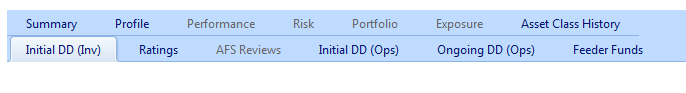 If Not Page.IsPostBack Then Dim tabSummary As New RadTab() tabSummary.Text = "Summary" tabSummary.NavigateUrl = "~/Funds/fundSummary.aspx?feederFundID=" & Request.QueryString("feederFundID") tabSummary.Enabled = True rtsFundTopNav.Tabs.Add(tabSummary) Dim tabProfile As New RadTab() tabProfile.Text = "Profile" tabProfile.NavigateUrl = "~/Funds/fundProfile.aspx?feederFundID=" & Request.QueryString("feederFundID") rtsFundTopNav.Tabs.Add(tabProfile) Dim tabPerformance As New RadTab() tabPerformance.Text = "Performance" tabPerformance.NavigateUrl = "~/Funds/fundPerformance.aspx?feederFundID=" & Request.QueryString("feederFundID") tabPerformance.Enabled = False rtsFundTopNav.Tabs.Add(tabPerformance) Dim tabRisk As New RadTab() tabRisk.Text = "Risk" tabRisk.NavigateUrl = "~/Funds/fundRisk.aspx?feederFundID=" & Request.QueryString("feederFundID") rtsFundTopNav.Tabs.Add(tabRisk) Dim tabPortfolio As New RadTab() tabPortfolio.Text = "Portfolio" tabPortfolio.NavigateUrl = "~/Funds/fundPortfolio.aspx?feederFundID=" & Request.QueryString("feederFundID") tabPortfolio.Enabled = False rtsFundTopNav.Tabs.Add(tabPortfolio) Dim tabExposure As New RadTab() tabExposure.Text = "Exposure" tabExposure.NavigateUrl = "~/Funds/fundExposure.aspx?feederFundID=" & Request.QueryString("feederFundID") tabExposure.Enabled = False tabExposure.IsBreak = True rtsFundTopNav.Tabs.Add(tabExposure) Dim tabFundReports As New RadTab() tabFundReports.Text = "Fund Reports" tabFundReports.NavigateUrl = "~/Funds/fundReports.aspx?feederFundID=" & Request.QueryString("feederFundID") rtsFundTopNav.Tabs.Add(tabFundReports) Dim tabFundDocuments As New RadTab() tabFundDocuments.Text = "Fund Documents" tabFundDocuments.NavigateUrl = "~/Funds/fundDocuments.aspx?feederFundID=" & Request.QueryString("feederFundID") rtsFundTopNav.Tabs.Add(tabFundDocuments) Dim tabContacts As New RadTab() tabContacts.Text = "Contacts" tabContacts.NavigateUrl = "~/Funds/fundContacts.aspx?feederFundID=" & Request.QueryString("feederFundID") rtsFundTopNav.Tabs.Add(tabContacts) Dim tabCommunications As New RadTab() tabCommunications.Text = "Calls and Meetings" tabCommunications.NavigateUrl = "~/Funds/fundCommunications.aspx?feederFundID=" & Request.QueryString("feederFundID") rtsFundTopNav.Tabs.Add(tabCommunications) Dim tabTasks As New RadTab() tabTasks.Text = "Tasks" tabTasks.NavigateUrl = "~/Funds/fundTasks.aspx?feederFundID=" & Request.QueryString("feederFundID") rtsFundTopNav.Tabs.Add(tabTasks) Dim tabHistory As New RadTab() tabHistory.Text = "History" tabHistory.NavigateUrl = "~/Funds/fundHistory.aspx?feederFundID=" & Request.QueryString("feederFundID") rtsFundTopNav.Tabs.Add(tabHistory) Dim tabAccounting As New RadTab() tabAccounting.Text = "Accounting" tabAccounting.NavigateUrl = "~/Funds/fundAccounting.aspx?feederFundID=" & Request.QueryString("feederFundID") tabAccounting.IsBreak = True rtsFundTopNav.Tabs.Add(tabAccounting) '-------------------------------------------------- 'Tabs in Question '-------------------------------------------------- Dim tabInitialIDD As New RadTab() tabInitialIDD.Text = "Initial DD (Inv)" tabInitialIDD.NavigateUrl = "~/Funds/MasterFunds/DueDiligence/initialIDD.aspx?masterFundID=" & masterFundID rtsFundTopNav.Tabs.Add(tabInitialIDD) Dim tabRatings As New RadTab() tabRatings.Text = "Ratings" tabRatings.NavigateUrl = "~/Funds/MasterFunds/DueDiligence/ratingSummary.aspx?masterFundID=" & masterFundID tabRatings.Enabled = True rtsFundTopNav.Tabs.Add(tabRatings) '--------------------------------------------------- Dim tabAFSReviews As New RadTab() tabAFSReviews.Text = "AFS Reviews" tabAFSReviews.NavigateUrl = "~/Funds/DueDiligence/afsReviews.aspx?feederFundID=" & Request.QueryString("feederFundID") tabAFSReviews.Enabled = False rtsFundTopNav.Tabs.Add(tabAFSReviews) Dim tabInitialODD As New RadTab() tabInitialODD.Text = "Initial DD (Ops)" tabInitialODD.NavigateUrl = "~/Funds/DueDiligence/initialODD.aspx?feederFundID=" & Request.QueryString("feederFundID") If fundType <> "Private Equity" And fundType <> "Hedge Fund" Then tabInitialODD.Enabled = False End If rtsFundTopNav.Tabs.Add(tabInitialODD) Dim tabOngoingDD As New RadTab() tabOngoingDD.Text = "Ongoing DD (Ops)" tabOngoingDD.NavigateUrl = "~/Funds/DueDiligence/ongoingODD.aspx?feederFundID=" & Request.QueryString("feederFundID") rtsFundTopNav.Tabs.Add(tabOngoingDD) If IsNumeric(Request.QueryString("selectedTab")) Then rtsFundTopNav.SelectedIndex = Request.QueryString("selectedTab") Else rtsFundTopNav.SelectedIndex = 0 End If End If Else Response.Clear() Response.Redirect("../default.aspx") Response.End() End IfEnd SubPublic WriteOnly Property activeTab() As String Set(ByVal value As String) rtsFundTopNav.Tabs.FindTabByText(value).Selected = True End SetEnd PropertyHere is the markup.