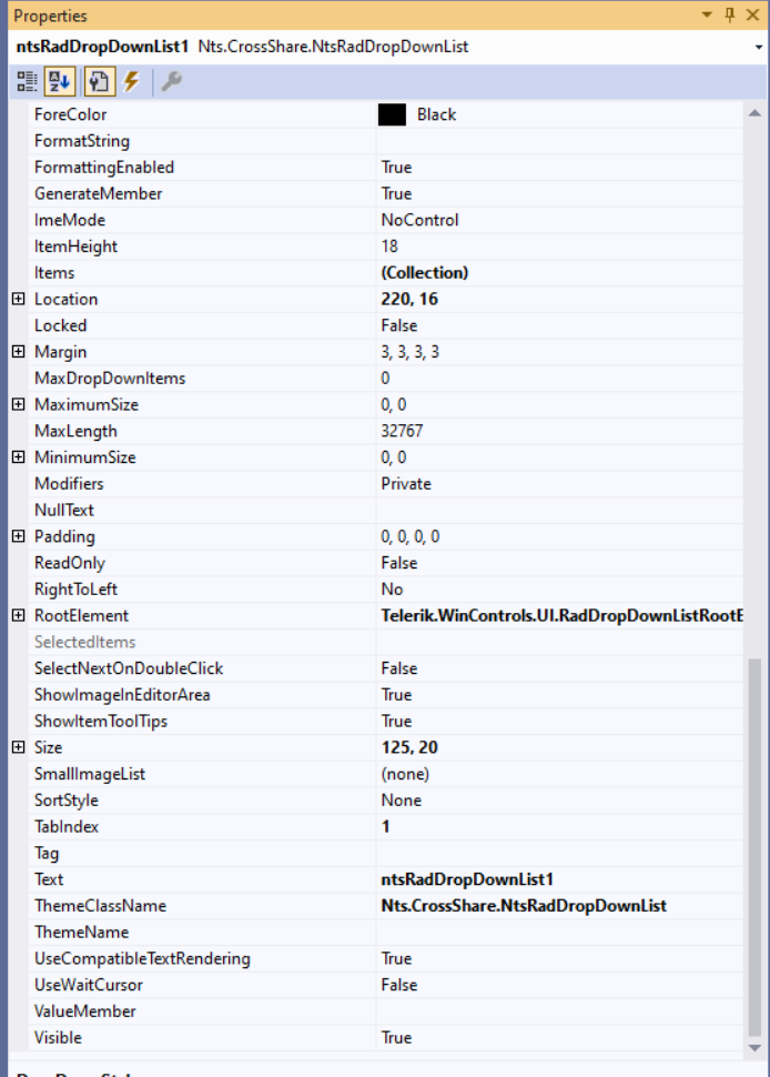Friend Class MyRadDropDwonList Inherits RadDropDownList Public Sub New() Me.DropDownStyle = Telerik.WinControls.RadDropDownStyle.DropDown Me.DropDownListElement.TextBox.TextBoxItem.TextBoxControl.TabStop = True End Sub Public Shadows Property TabStop() As Boolean Get Return Me.DropDownListElement.TextBox.TextBoxItem.TextBoxControl.TabStop End Get Set(ByVal value As Boolean) Me.DropDownListElement.TextBox.TextBoxItem.TextBoxControl.TabStop = value End Set End PropertyEnd ClassThe important part is that the drop down style must be set before the TabStop, setting it after that will reset the TabStop.