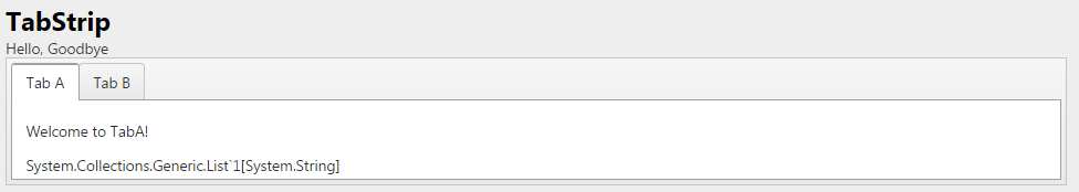 public ActionResult TabStrip(){ ViewBag.Message = "TabStrip Test"; List<string> details = new List<string>(); details.Add("Hello"); details.Add("Goodbye"); return View(details);}public ActionResult TabA(List<string> details){ return PartialView(details);}public ActionResult TabB(List<string> details){ return PartialView(details);}The main View:
