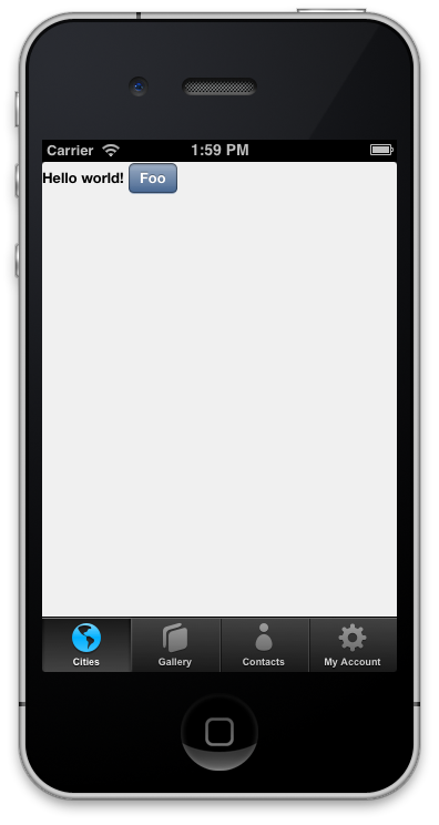 <!DOCTYPE html><html> <head> <link href="kendo/styles/kendo.mobile.all.min.css" rel="stylesheet" /> <title>Hello World!</title> </head><body> <div data-role="view"> Hello world! <a data-role="button">Foo</a> <footer data-role="footer"> <div data-role="tabstrip"> <a data-icon="globe" href="#overview-cities">Cities </a><a data-icon="organize" href="#overview-gallery">Gallery </a><a data-icon="contacts" href="#overview-contacts">Contacts </a><a data-icon="settings" href="#overview-account">My Account</a> </div> </footer> </div> <script src="cordova-2.5.0.js"></script> <script src="kendoui/js/jquery.min.js"></script> <script src="kendoui/js/kendo.mobile.min.js"></script> <script type="text/javascript"> document.addEventListener("deviceready", function() { var app = new kendo.mobile.Application(); }); </script></body></html>And it worked fine (see attached screenshot). Can you please let me know what else is needed in order for me to reproduce the problem? Thank you in advance. Regards,
