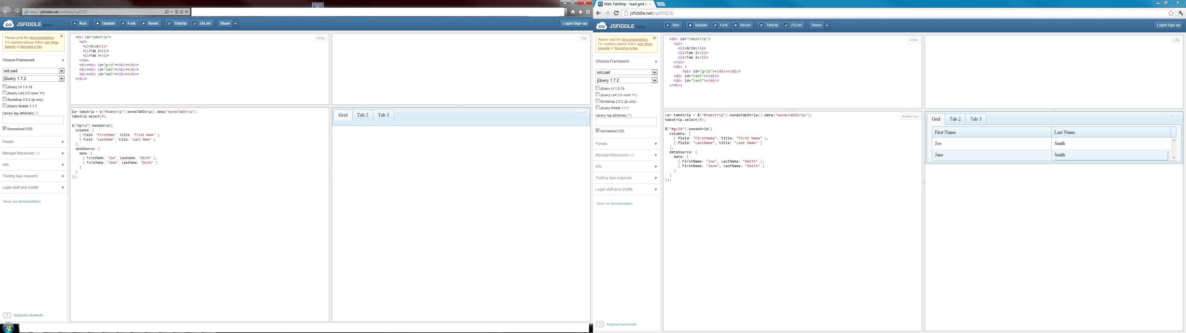 I am attempting to load a grid into the content of the first tab in a tabstrip. I have tried several variations of the code and how the grid loads, including via the "activate" event. Here is a jsfiddle of a basic version of the code. The grid works with the tabstrip code commented out. It seems like it would be a simple oversight.