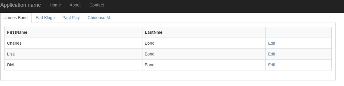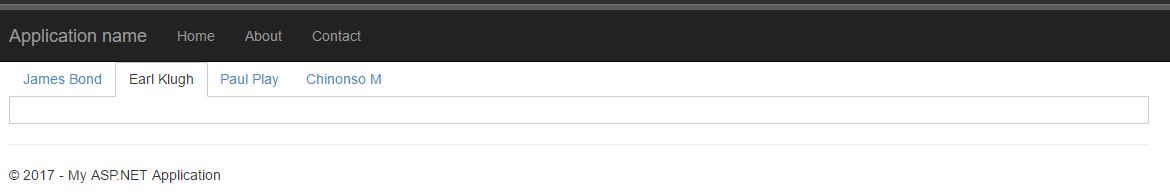 01.<div class="demo-section k-content">02. @(Html.Kendo().TabStrip()03. .Name("tabstrip")04. .Events(events => events05. .Select("onSelect")06. )07. .Animation(animation =>08. animation.Open(effect =>09. effect.Fade(FadeDirection.In)))10. .Items(tabstrip =>11. {12. tabstrip.Add().Text("James Bond")13. .Selected(true)14. .Content(@<text>15. <div id="partialPlaceHolder" style="display:none;">16. 17. </div>18. </text>);19. 20. tabstrip.Add().Text("Earl Klugh")21. .Content(@<text>22. <div id="partialPlaceHolder" style="display:none;">23. 24. </div>25. </text>);26. 27. tabstrip.Add().Text("Paul Play")28. .Content(@<text>29. <div id="partialPlaceHolder" style="display:none;">30. 31. </div>32. </text>);33. 34. tabstrip.Add().Text("Chinonso M")35. .Content(@<text>36. <div id="partialPlaceHolder" style="display:none;">37. 38. </div>39. </text>);40. })41.)42.</div>43. 44.<script type="text/javascript">45. 46. $(document).ready(function () {47. $("#tabstrip").kendoTabStrip({48. animation: {49. open: {50. effects: "fadeIn"51. }52. }53. });54. 55. $.get('/Parent/MyAction', { id: 1 }, function (data) {56. 57. $('#partialPlaceHolder').html(data);58. /* little fade in effect */59. $('#partialPlaceHolder').fadeIn('fast');60. })61. });62. 63. function onSelect(e) {64. // alert($(e.item).find("> .k-link").text());65. //$(e.contentElement).html("");66. var tabName = $(e.item).find("> .k-link").text();67. var id = 0;68. 69. if (tabName == "James Bond"){ id = 1; }70. 71. else if (tabName == "Earl Klugh"){ id = 2; }72. 73. else if (tabName == "Paul Play") { id = 3; }74. 75. else if (tabName == "Chinonso M"){ id = 4; }76. 77. $.get('/Parent/MyAction', { id: id }, function (data) {78. 79. $('#partialPlaceHolder').html(data);80. /* little fade in effect */81. $('#partialPlaceHolder').fadeIn('fast');82. })83. 84. //var ts = $("#tabstrip").data().kendoTabStrip;85. //var item = ts.items()[1];86. //ts.reload(item);87. 88. var ts = $("#tabstrip").data().kendoTabStrip;89. ts.tabGroup.on('click', 'li', function (e) {90. ts.reload($(this));91. })92. }93. 94.</script>