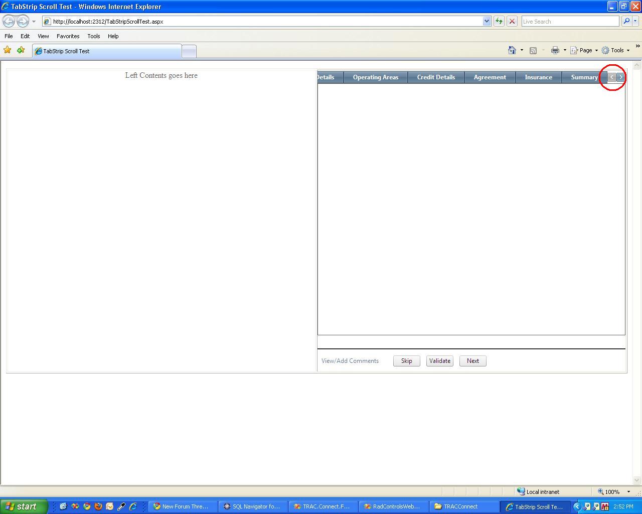 <%@ Page Language="C#" AutoEventWireup="true" CodeBehind="TabStripScrollTest.aspx.cs" Inherits="RadControlsWebApp1.TabStripScrollTrest" %><!DOCTYPE html PUBLIC "-//W3C//DTD XHTML 1.0 Transitional//EN" "http://www.w3.org/TR/xhtml1/DTD/xhtml1-transitional.dtd"><html xmlns="http://www.w3.org/1999/xhtml" ><head runat="server"> <title>TabStrip Scroll Test</title></head><body> <form id="form1" runat="server"> <div> <telerik:RadScriptManager runat="server" ID="RadGridScriptManager"> </telerik:RadScriptManager> <table width="100%" cellpadding="0px" border="1"> <tr> <!-- Left Content Start--> <td valign="top" align="center" style="width:20%;border:1px solid #EEE;color:#666;"> <div id="leftdiv" class="leftdivtitle"> </div> Left Contents goes here </td> <!-- Left Content End --> <!-- Right Content Start --> <td valign="top" style="width:20%;color:#EEE;"> <telerik:RadAjaxManager ID="RadAjaxManager1" runat="server"> <AjaxSettings> <telerik:AjaxSetting AjaxControlID="pnlTab"> <UpdatedControls> <telerik:AjaxUpdatedControl ControlID="radBtnBack" LoadingPanelID="RadAjaxLoadingPanel1" /> <telerik:AjaxUpdatedControl ControlID="radBtnSkip" LoadingPanelID="RadAjaxLoadingPanel1" /> <telerik:AjaxUpdatedControl ControlID="radBtnNext" LoadingPanelID="RadAjaxLoadingPanel1" /> <telerik:AjaxUpdatedControl ControlID="radBtnFinish" LoadingPanelID="RadAjaxLoadingPanel1" /> </UpdatedControls> </telerik:AjaxSetting> <telerik:AjaxSetting AjaxControlID="radBtnBack"> <UpdatedControls> <telerik:AjaxUpdatedControl ControlID="pnlTab" LoadingPanelID="RadAjaxLoadingPanel1" /> </UpdatedControls> </telerik:AjaxSetting> <telerik:AjaxSetting AjaxControlID="radBtnSkip"> <UpdatedControls> <telerik:AjaxUpdatedControl ControlID="pnlTab" LoadingPanelID="RadAjaxLoadingPanel1" /> <telerik:AjaxUpdatedControl ControlID="radBtnBack" LoadingPanelID="RadAjaxLoadingPanel1" /> </UpdatedControls> </telerik:AjaxSetting> <telerik:AjaxSetting AjaxControlID="radBtnSave"> <UpdatedControls> <telerik:AjaxUpdatedControl ControlID="pnlTab" LoadingPanelID="RadAjaxLoadingPanel1" /> <telerik:AjaxUpdatedControl ControlID="pnlViewAgreement" LoadingPanelID="RadAjaxLoadingPanel1" /> </UpdatedControls> </telerik:AjaxSetting> <telerik:AjaxSetting AjaxControlID="radBtnNext"> <UpdatedControls> <telerik:AjaxUpdatedControl ControlID="pnlTab" LoadingPanelID="RadAjaxLoadingPanel1" /> </UpdatedControls> </telerik:AjaxSetting> </AjaxSettings> </telerik:RadAjaxManager> <asp:Panel runat="server" ID="pnlRightContent" Height="600px" ScrollBars="Auto" Style="position: relative;"> <asp:Panel runat="server" ID="pnlTab"> <asp:HiddenField ID="previousTabHidden" runat="Server" /> <telerik:RadTabStrip ID="radTabStripCompanyRegistration" runat="server" MultiPageID="radMultiPageCompanyRegistration" AutoPostBack="true" SelectedIndex="0" ScrollChildren="True" Skin="WebBlue"> <Tabs> <telerik:RadTab runat="server" Text="Company Info" PageViewID="radPageViewCompanyInfo" Font-Bold="True" Selected="True"> </telerik:RadTab> <telerik:RadTab runat="server" Text="Addresses" PageViewID="radPageViewAddresses" Font-Bold="True"> </telerik:RadTab> <telerik:RadTab runat="server" Text="Contacts" PageViewID="radPageViewContacts" Font-Bold="True"> </telerik:RadTab> <telerik:RadTab runat="server" Text="Company Details" PageViewID="radPageViewCompanyDetails" Font-Bold="True"> </telerik:RadTab> <telerik:RadTab runat="server" Text="Operating Areas" PageViewID="radPageViewOperatingAreas" Font-Bold="True"> </telerik:RadTab> <telerik:RadTab runat="server" Text="Credit Details" PageViewID="radPageViewCreditDetails" Font-Bold="True"> </telerik:RadTab> <telerik:RadTab runat="server" Text="Agreement" PageViewID="radPageViewAgreement" Font-Bold="True"> </telerik:RadTab> <telerik:RadTab runat="server" Text="Insurance" PageViewID="radPageViewInsurance" Font-Bold="True"> </telerik:RadTab> <telerik:RadTab runat="server" Text="Summary" PageViewID="radPageViewSummary" Font-Bold="True"> </telerik:RadTab> </Tabs> </telerik:RadTabStrip> <telerik:RadMultiPage runat="server" ID="radMultiPageCompanyRegistration" SelectedIndex="0" Width="100%"> <!-- Company Info Tab Start--> <telerik:RadPageView runat="server" ID="radPageViewCompanyInfo" BorderColor="#666666" BorderWidth="1px" Height="500px" Selected="true"> <asp:Panel runat="server" ID="pnlCompanyInfo" CssClass="companyregpanel"> <%-- <uc1:CompanyInfo ID="CompanyInfo" runat="server" />--%> </asp:Panel> </telerik:RadPageView> <!-- Company Info Tab End--> <!-- Addresses Tab Start --> <telerik:RadPageView runat="server" ID="radPageViewAddresses" BorderColor="#666666" BorderWidth="1px" Height="500px"> <asp:Panel runat="server" ID="pnlAddresses" CssClass="companyregpanel"> <%--<uc2:addresses id="Addresses" runat="server" />--%> </asp:Panel> </telerik:RadPageView> <!-- Addresses Tab End --> <!-- Contact Tab Start --> <telerik:RadPageView runat="server" ID="radPageViewContacts" BorderColor="#666666" BorderWidth="1px" Height="500px"> <asp:Panel runat="server" ID="pnlContacts" CssClass="companyregpanel"> <%--<uc3:contacts id="Contacts1" runat="server" />--%> </asp:Panel> </telerik:RadPageView> <!-- Contact Tab End --> <!-- Company Details Tab Start --> <telerik:RadPageView runat="server" ID="radPageViewCompanyDetails" BorderColor="#666666" BorderWidth="1px" Height="500px"> <asp:Panel runat="server" ID="pnlCompanyDetails" CssClass="companyregpanel"> <%-- <uc4:companydetails id="CompanyDetails1" runat="server" />--%> </asp:Panel> </telerik:RadPageView> <!-- Company Details Tab End --> <!-- Operating Ares Tab Start --> <telerik:RadPageView runat="server" ID="radPageViewOperatingAreas" BorderColor="#666666" BorderWidth="1px" Height="500px"> <asp:Panel runat="server" ID="pnlOperatingAreas" CssClass="companyregpanel"> <%-- <uc5:operatingareas id="OperatingAreas1" runat="server" />--%> </asp:Panel> </telerik:RadPageView> <!-- Operating Ares Tab End --> <!-- Credit Details Tab Start --> <telerik:RadPageView runat="server" ID="radPageViewCreditDetails" BorderColor="#666666" BorderWidth="1px" Hei
