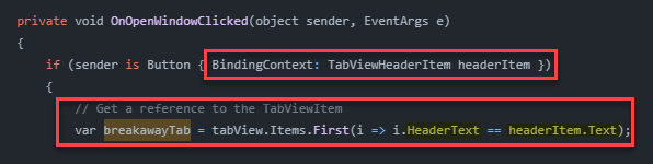 As to how you'd use this knowledge, you would need to write a behavior (or similar) to be able to use code to get those references, as it cannot be done in XAML with bindings alone. In the behavior, you can pass both a reference to the TabView and the TabViewHeaderItem, this is enough to find the original tab.