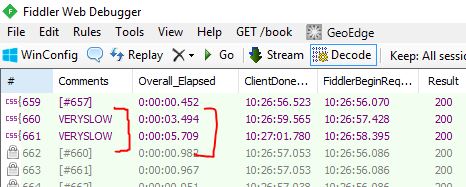 1) Do we have a way (not while capturing, but reviewing a trace offline) to ask fiddler to identify for me sessions that are slow. For example <500 ms put color green, 500 to 1 sec orange, and >1 sec red ?