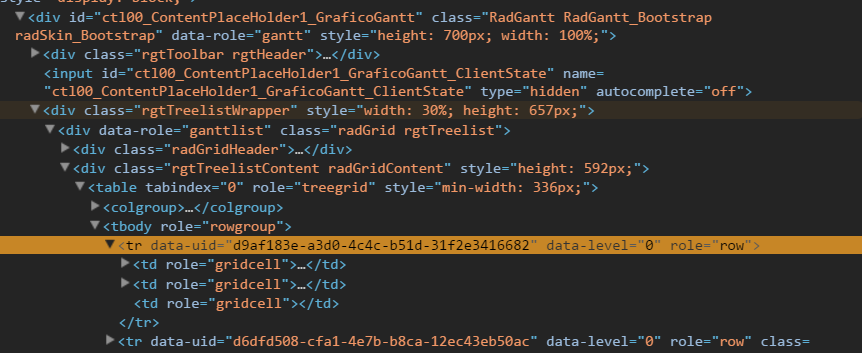 $telerik.$(".rgtTreelistContent tr").on("click", function(e) { var $element = $telerik.$(e.target); if (!$element.is("tr")) { $element = $element.parents("tr").first(); } var taskUid = $element.attr("data-uid");});Regards,