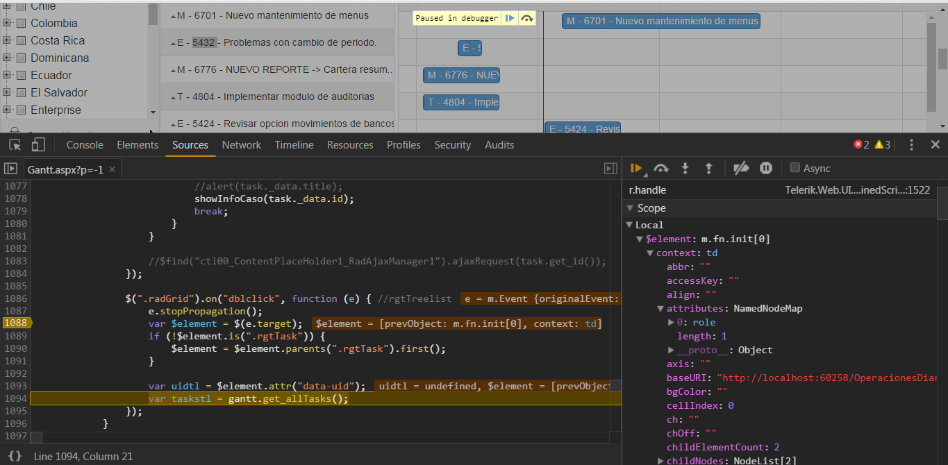 $(".radGrid").on("dblclick", function (e) { //rgtTreelist e.stopPropagation(); var $element = $(e.target); if (!$element.is(".radGrid")) { $element = $element.parents(".rgtTreelistContent").first(); } var uidtl = $element.attr("data-uid"); var taskstl = gantt.get_allTasks();});The code is not working because the selectors are not correct. Please use the code from my previous example and it should work: