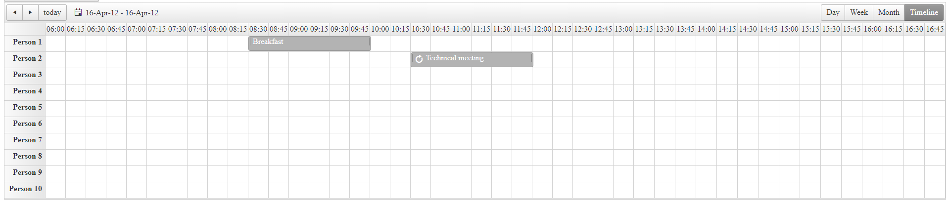 <telerik:RadScheduler RenderMode="Lightweight" runat="server" ID="RadScheduler1" SelectedDate="2012-04-16" Width="100%" OnDataBound="RadScheduler1_DataBound" OnAppointmentCreated="RadScheduler1_AppointmentCreated" EnableDescriptionField="true" OverflowBehavior="Auto" DayStartTime="08:00:00" DayEndTime="18:00:00" TimelineView-GroupBy="User" GroupingDirection="Vertical" SelectedView="TimelineView" TimelineView-SlotDuration="00:15:00" TimelineView-NumberOfSlots="44" TimelineView-StartTime="06:00:00"> <TimelineView ColumnHeaderDateFormat="HH:mm" ShowInsertArea="false" /> <AppointmentTemplate> <span><%# Eval("Subject") %></span> <div style="font-style: italic;"><%# Eval("Description") %></div> </AppointmentTemplate></telerik:RadScheduler>To run the project, you should just place the .NET 4.5 version of the Telerik assemblies in the bin folder of the project.