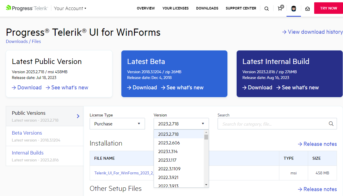 Note that the available versions are related to the active license. If you are looking for a specific version, but it isn't listed, contact our sales team, and they will enable the version for download: sales@telerik.com