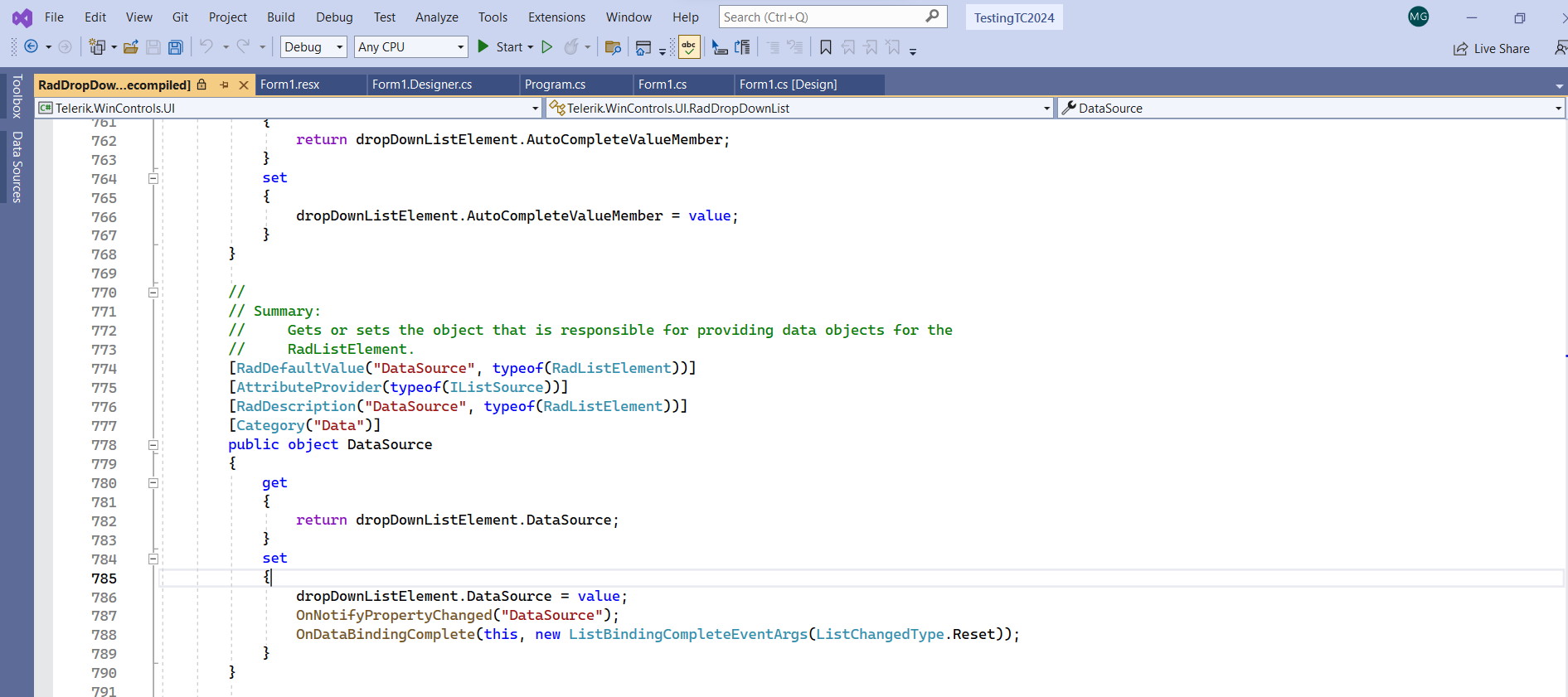 Where as the Same code recursive call is not restricted for Datasource, SelectedIndex and SeletedValue in VS 2022 - Telerick 2023