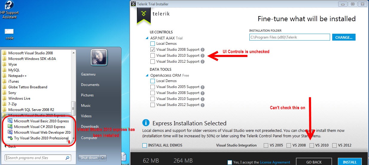 I got Microsoft Visual Studio 2010 Express installed on my machine. However as I try to install the Telerik_Reporting_Trial_Installer_Q3_2012_SP1_v6_2_13_110 it does not recognize the currently installed vs. The checkbox is unchecked which I think it wasn't able to find the installed vs and no way I could check on the checkbox items.