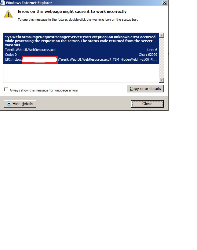 Message: Sys.WebForms.PageRequestManagerServerErrorException: An unknown error occurred while processing the request on the server. The status code returned from the server was: 404