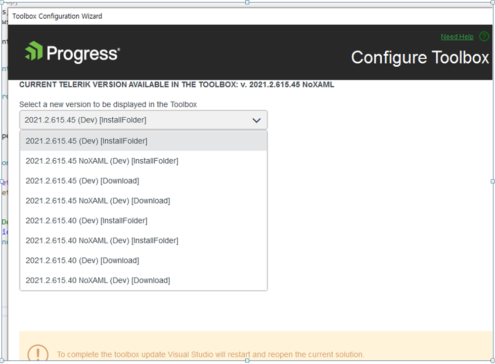 - telerik 2021.2.615 and vs2019 16.10.2 installed.