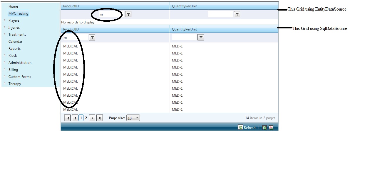 Case Sensitive is not working using EntityDataSource. but it is working in sqlDataSource. in this case we can not tell users case sensitive is not working. please check the attached Screen shot and let us know ASAP.