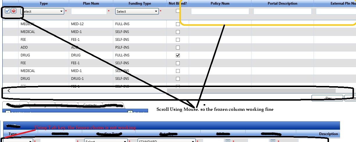 i am using Radgrid Frozen column. if use mouse to scroll for insert or update frozen column not hiding. but i use tab key for move next column frozen not working. Please check the Screen shot and let know ASAP.