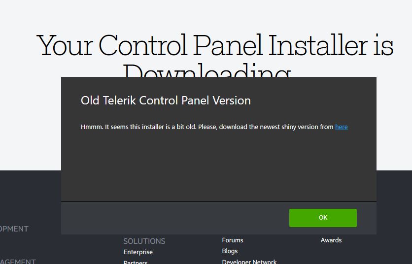 - Perform an install or modify action of a product to successfully install the latest version of Telerik Control Panel