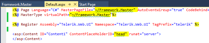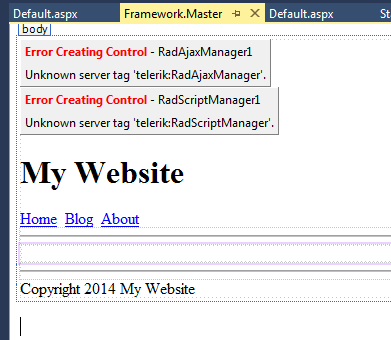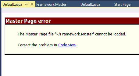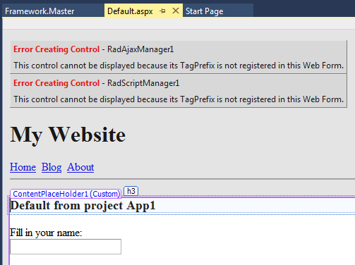 I have build a small solution to illustrate the idea of our framework with the main project ("Framework") and one application ("App1"). If I open the default.aspx in App1 in designer mode I get error op the RadAJAXManager and the RadScriptmanager both placed in the master page - see images attached "Designer.png" and in the source mode get an error on the reference to the master page - see images "Source.aspx.png".