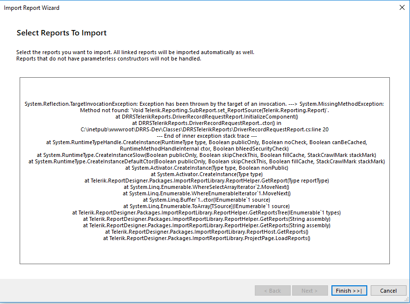 I am trying to open an old Telerik 4 report DLL created in C# some 10 years ago. I am guessing the dll is circa Visual Studio 2010 or earlier with the Visual Studio Telerik designer of it's time. The report runs fine, but I am trying to upgrade it to the latest Telerik version. I was hoping to open the DLL in Designer (x86) and save as a .trdx and then open in Telerik Designer (64 bit) and save out to dll or something. When I try to open the dll, is get this error. What can I do?