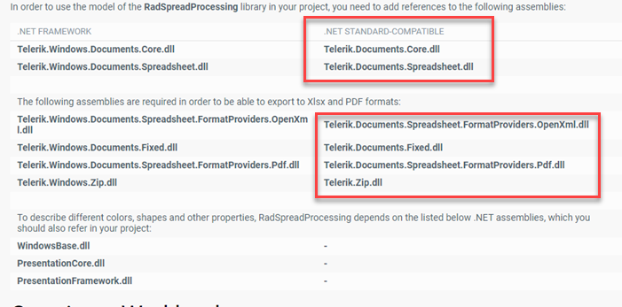 Since you're using SpreadProcessing libraries, you can find the required packages in RadSpreadProcessing Getting Started documentation. As this is .NET Core project, you need to use .NET Standard version, which is listed under the .NET STANDARD-COMPATIBLE section.