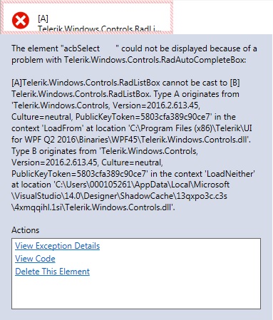 Attached image shows the error displayed in the XAML designer for each and every Telerik control in the entire solution. The error occurred after I added a new WPF Custom Control Library to the solution which I have since removed. How do I resolve this?