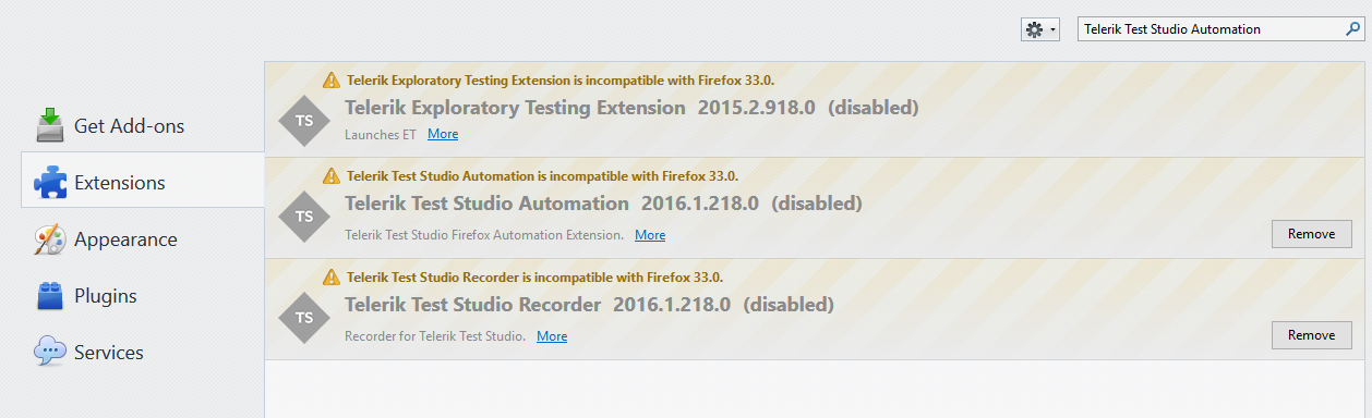 Hello, I'm using the trial of Test Studio and am having trouble testing on Firefox. When I go to manage the extensions, it says "Telerik Exploratory Testing Extension is incompatible with Firefox 33.0. I'll attach some screen shots.