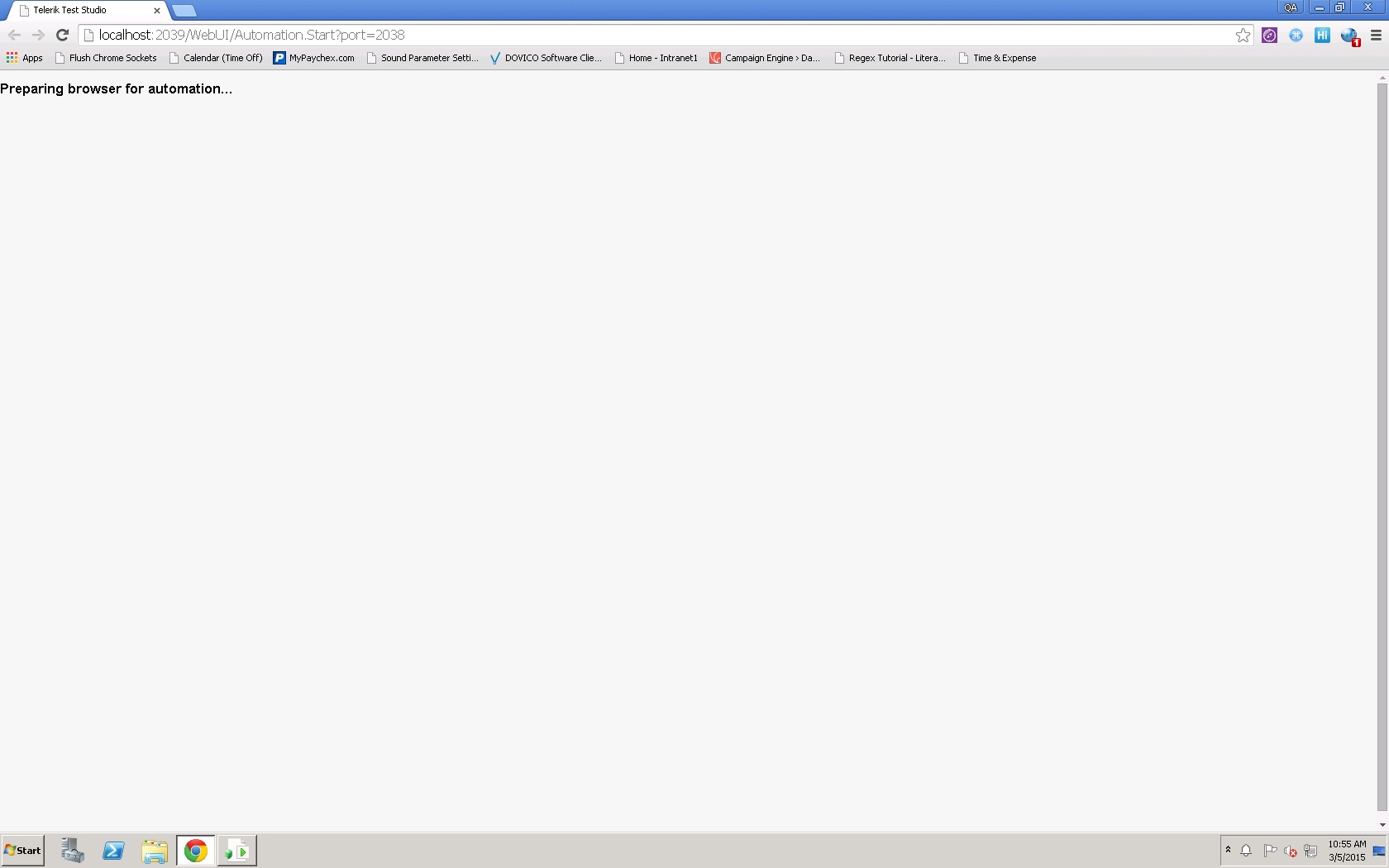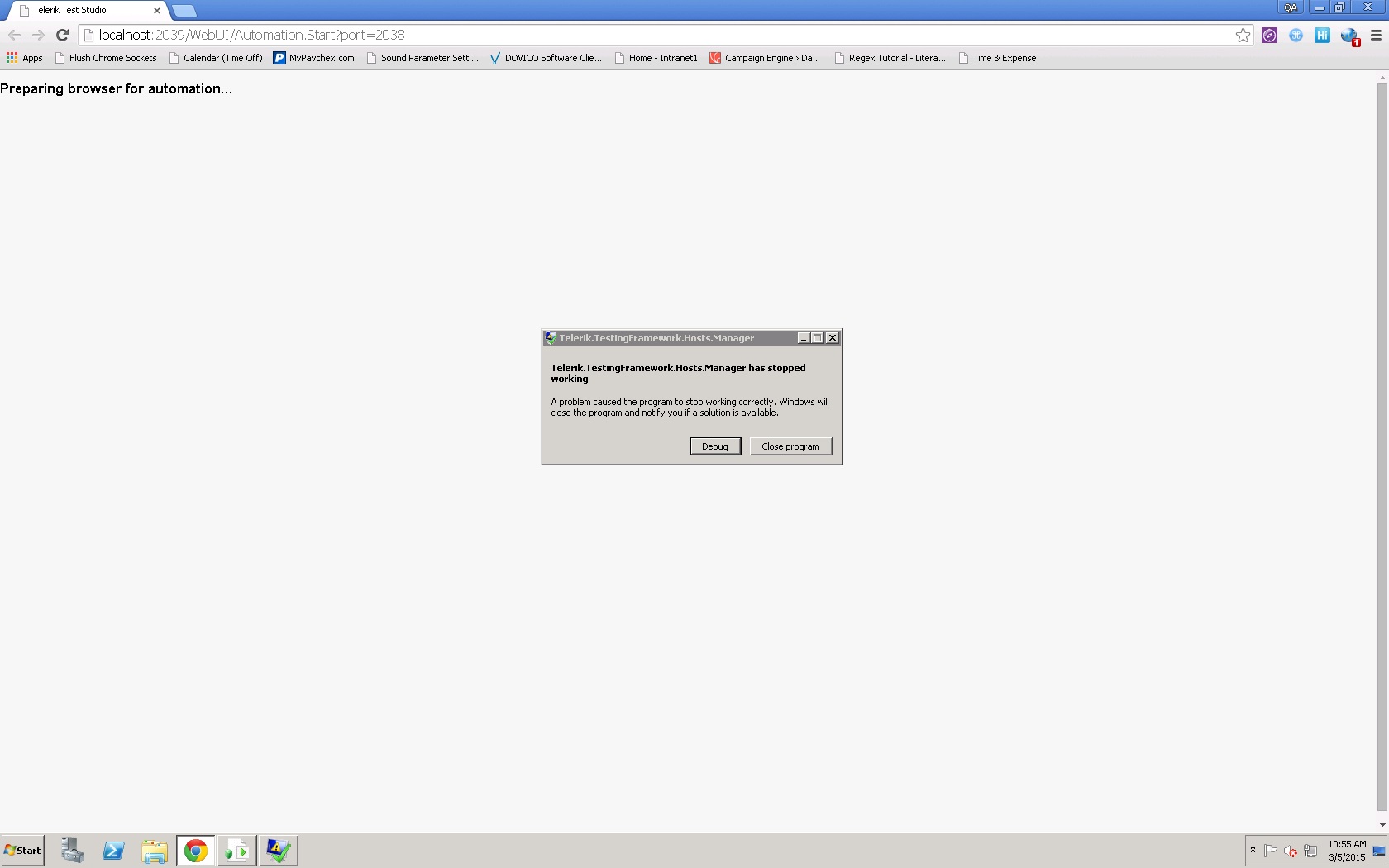 I am running into this problem consistently. I do not see this issue when running locally, and the same automation will run fine in Internet Explorer 11. It fails when we attempt to run any test in Chrome on a VM through Microsoft Test Manager. The VM has the most up to date Chrome and Telerik Automation Framework. The VM is Windows Server 2008 R2 Standard Service Pack 1 with Visual Studio 2013 installed. See the attached file for a screen shot of what appears: Chrome opens a window, then throws a Telerik.TestingFramework.Hosts.Manager error. Below is the stack trace and error message