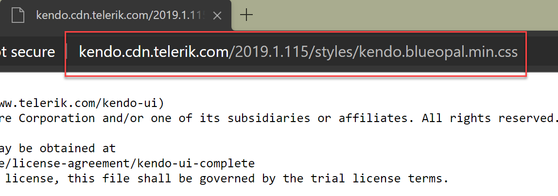 <link href="http://kendo.cdn.telerik.com/2019.1.115/styles/kendo.common.min.css" rel="stylesheet" /> <link href="http://kendo.cdn.telerik.com/2019.1.115/styles/kendo.blueopal.min.css" rel="stylesheet" />