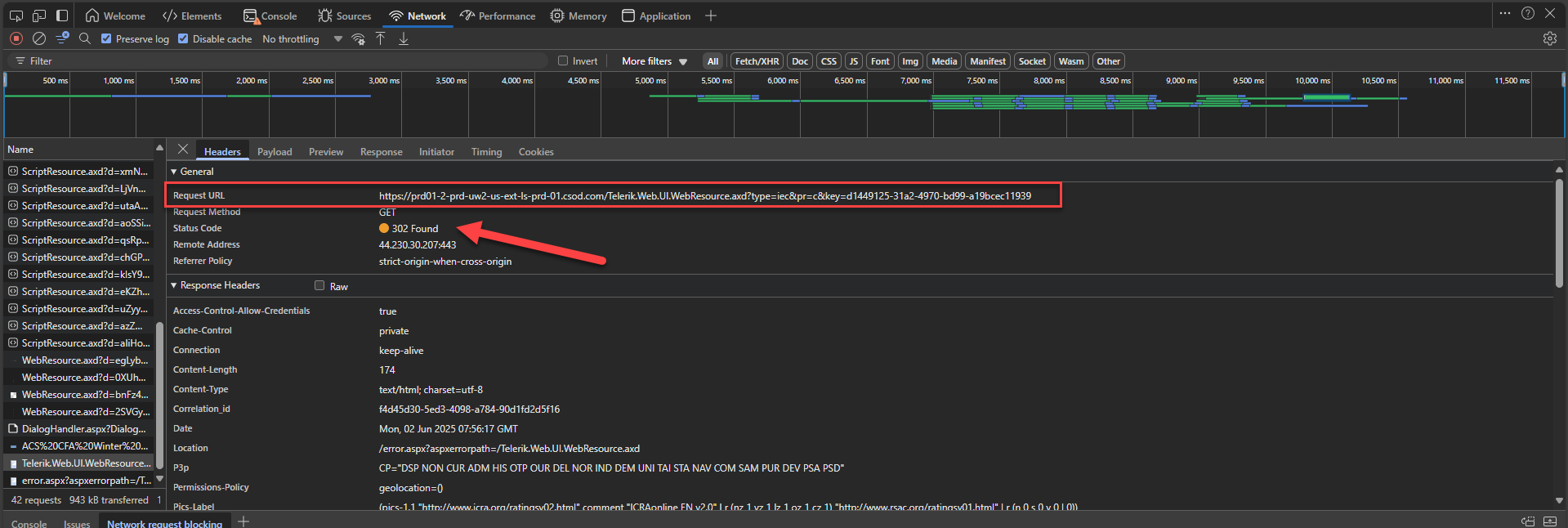 Is there a URL redirect in the app or in IISE on your machine/server? The status code of 302 (Status 302 MDN) means that the issue is due to a redirect.