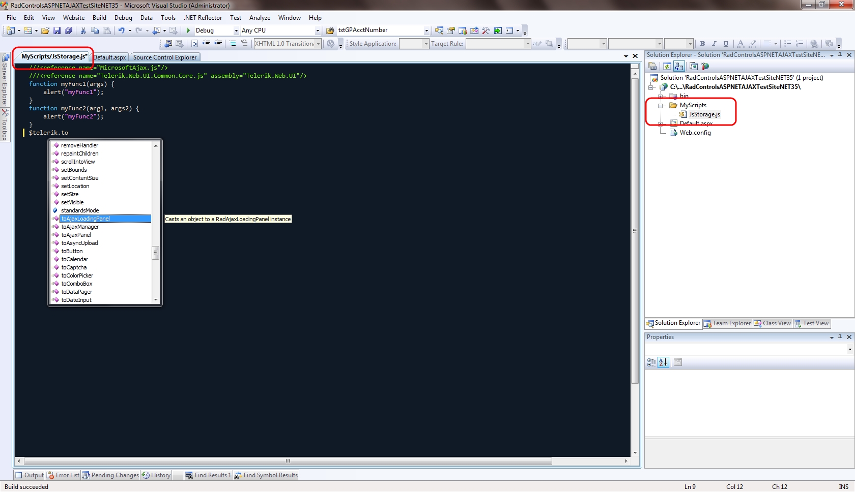 Please note that Telerik.Web.UI.XML file has nothing in common with the Javascript Intellisense. I have run your project in VS 2010 and it worked as expected (check the attached images). Based on that I would like to emphasize on the following: