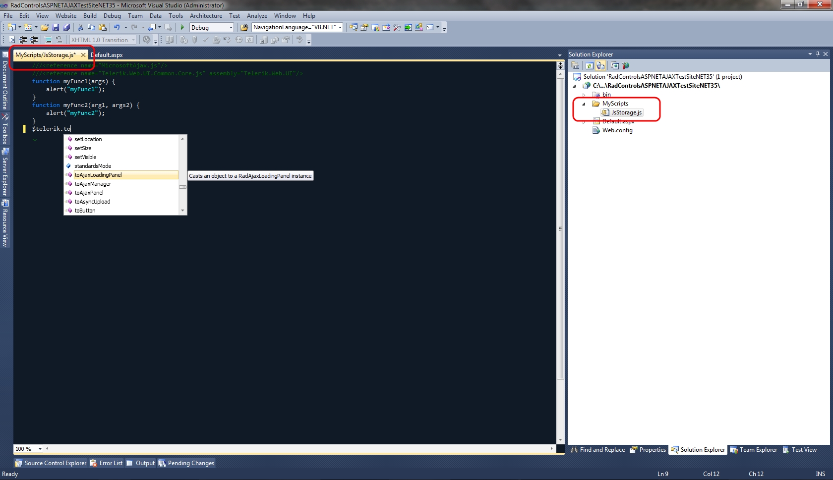 Following your feedback I moved the .js file in a separate folder, but Javascript Intellisense still worked as expected. I am attaching two screenshots that show the results I got in VS 2008 and VS 2010. Note that you may need to update the Javascript Intellisense (ctrl+shift+J) after you load your project in VS.