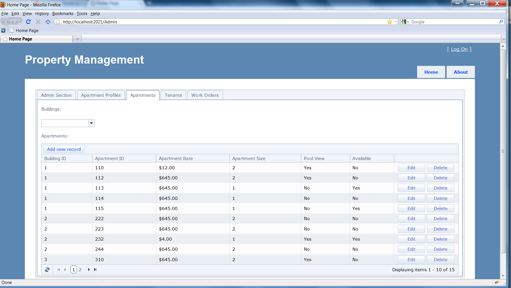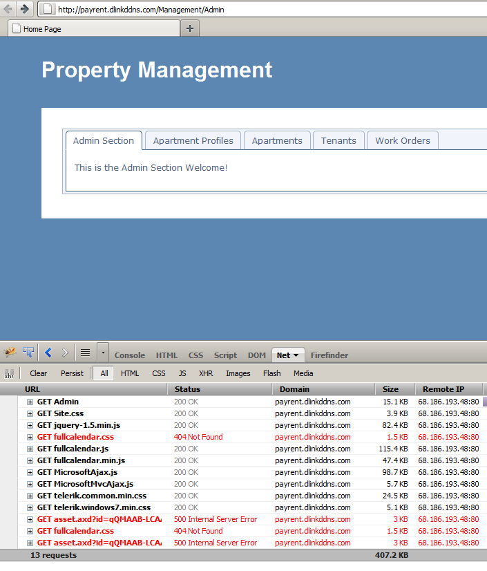 Also you will notice that when you click on the tabs the address changes at the top which means it is not loading the partial view within the parent view. In the VS on my local machine the content loads nicely within the main Admin View. Here is the code for the Apartment View to be loaded within the Admin Tabstrip view