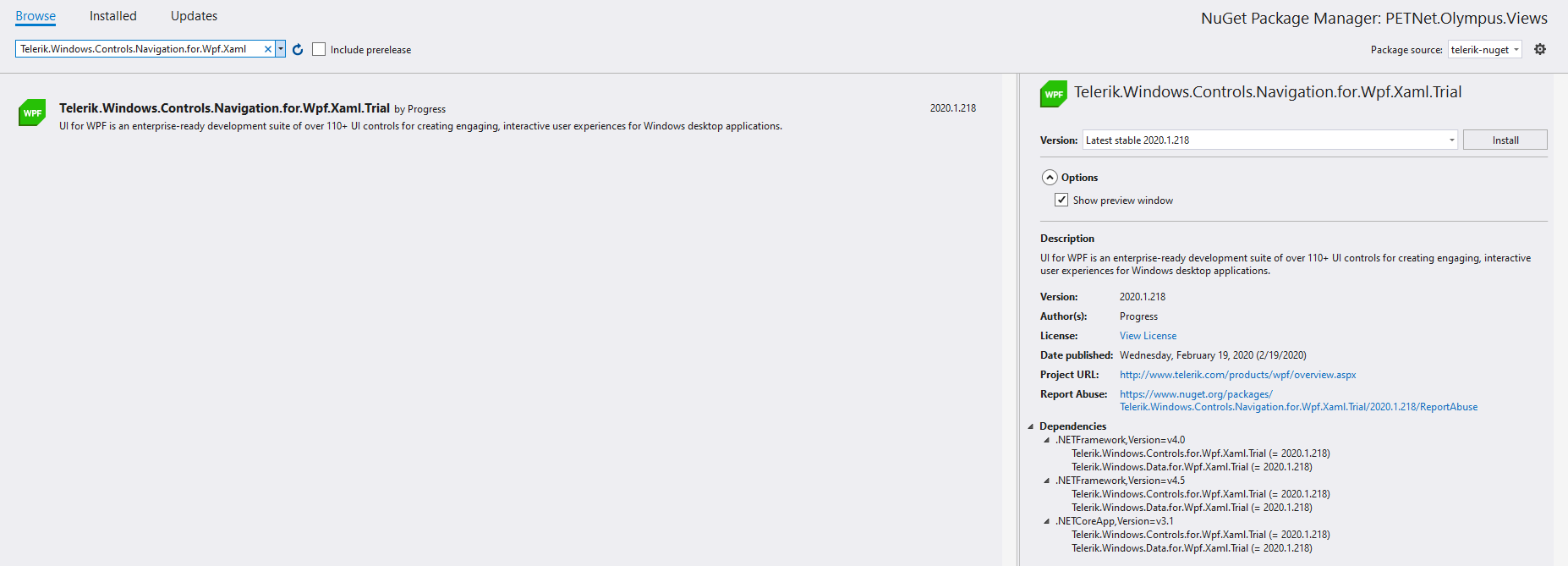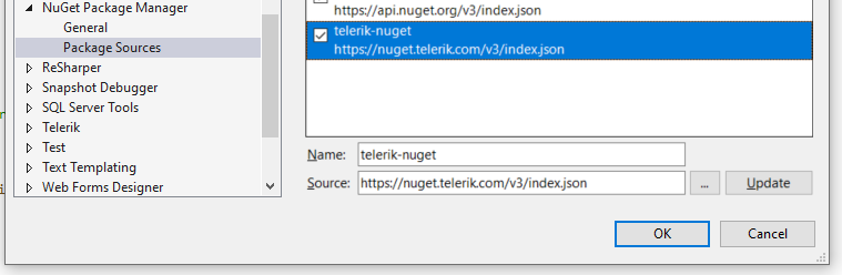 Can you show me the configuration of the Telerik's nuget server in Visual Studio?