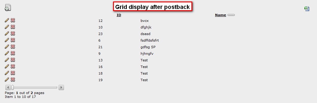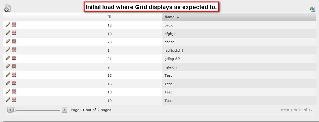 During the initial load, grid displays as expected but after a post back (i.e. click of Edit button in grid which displays another panel in same page and click of Cancel button in the displayed panel) the grid displays without any Skin/Theme. Attached is the screen shot for reference.